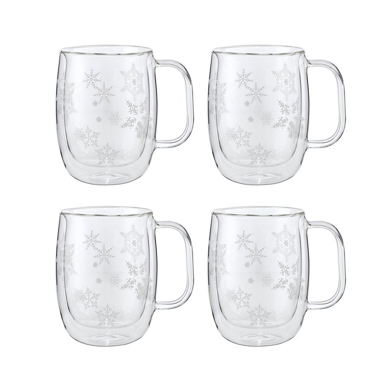 Add a little holiday magic to your favorite beverage.Welcome winter with ZWILLING Sorrento Plus Holiday Mugs. This set, created by the renowned Italian designer Matteo Thun, features 4 double wall mugs adorned with festive snowflakes. Whether you enjoy a warming coffee, a soothing tea, or a decadent hot chocolate, these mugs turn every beverage into a special holiday treat.Because they’re double wall, these mugs maintain the toasty temperature of all your winter beverages. You can also elegantly serve up hot toddies or mulled wine thanks to their chic translucence.Each mug is constructed from high quality, sturdy borosilicate glass for everyday durability. Mouth-blown by skilled artisans, these finely crafted mugs will enhance your enjoyment of all your winter beverages.