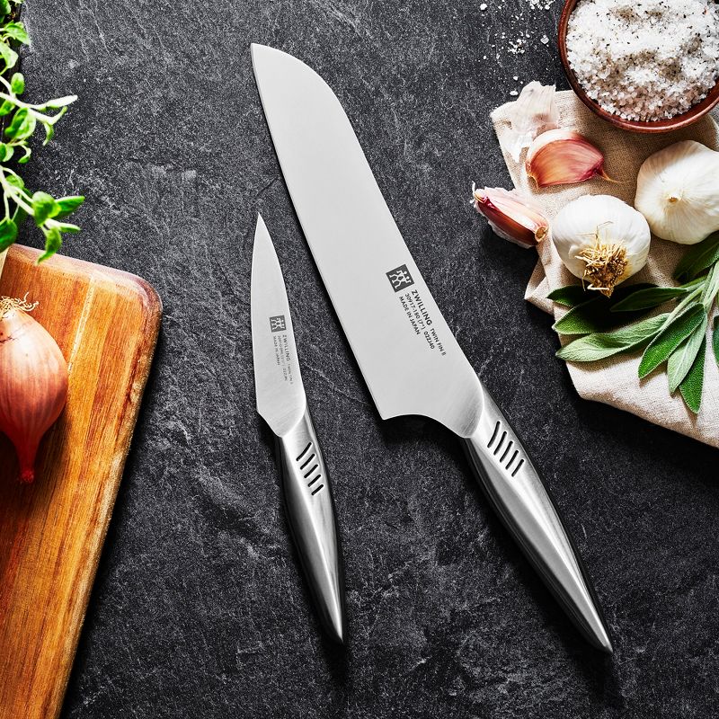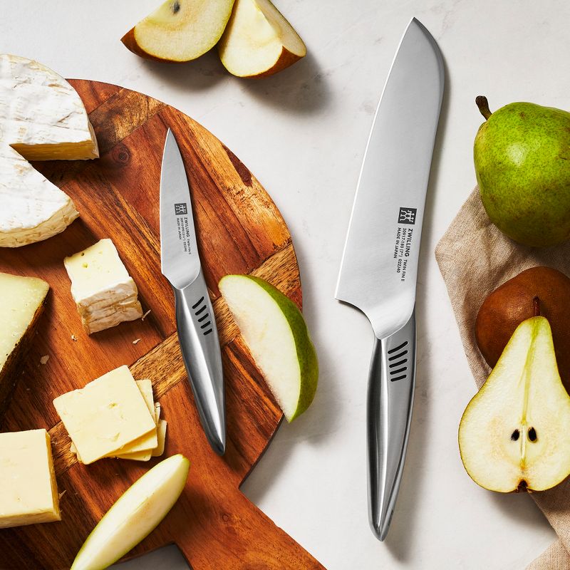 Introducing TWIN Fin II: Our NEW High performance Dishwasher Safe KnivesFeaturing a precision honed and laser-controlled edge that is incredibly sharp from the first use and stays sharper longer, the entire length of the TWIN Fin II blade can be used and sharpened, from bolster to tip. The blade is constructed of N-60 special formula stainless steel, which is highly corrosion resistant and offers improved hardness - approximately 60 on the Rockwell scale. The FRIODUR® ice-hardened blade starts sharp, stays sharper longer, and will not stain or chip. This exceptional corrosion resistance means these high-performance knives are conveniently dishwasher safe.The innovative curved bolster is meant to be an extension of the hand. The curved bolster supports both classic Western circular or rocking cuts and Asian chopping style cuts.Boasting a comfortable and contemporary-style, perfectly balanced 18/8 stainless steel handle, TWIN FIN II knives are designed for fatigue-free cutting. Each knife is handcrafted by skilled artisans in the ZWILLING factory in Seki– the knife-making capital of Japan.