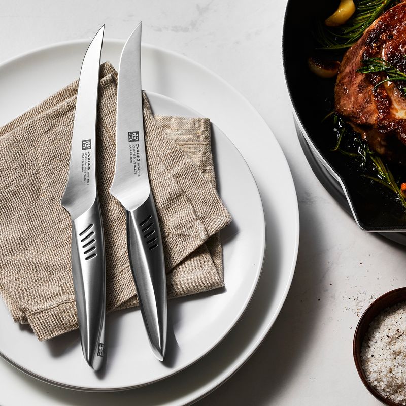 Introducing TWIN Fin II: Our NEW High performance Dishwasher Safe KnivesFeaturing a precision honed and laser-controlled edge that is incredibly sharp from the first use and stays sharper longer, the entire length of the TWIN Fin II blade can be used and sharpened, from bolster to tip. The blade is constructed of N-60 special formula stainless steel, which is highly corrosion resistant and offers improved hardness - approximately 60 on the Rockwell scale. The FRIODUR® ice-hardened blade starts sharp, stays sharper longer, and will not stain or chip. This exceptional corrosion resistance means these high-performance knives are conveniently dishwasher safe.The innovative curved bolster is meant to be an extension of the hand. The curved bolster supports both classic Western circular or rocking cuts and Asian chopping style cuts.Boasting a comfortable and contemporary-style, perfectly balanced 18/8 stainless steel handle, TWIN FIN II knives are designed for fatigue-free cutting. Each knife is handcrafted by skilled artisans in the ZWILLING factory in Seki– the knife-making capital of Japan.